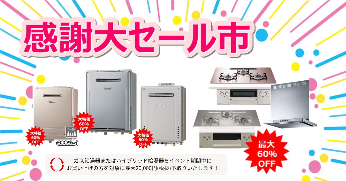 今ならガス機器をお得に購入できるビックチャンスです!ガスユーザーさま限定で、人気のガスコンロやガス給湯器などが最大60%OFFでお買い求めいただけます。